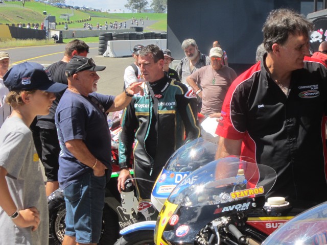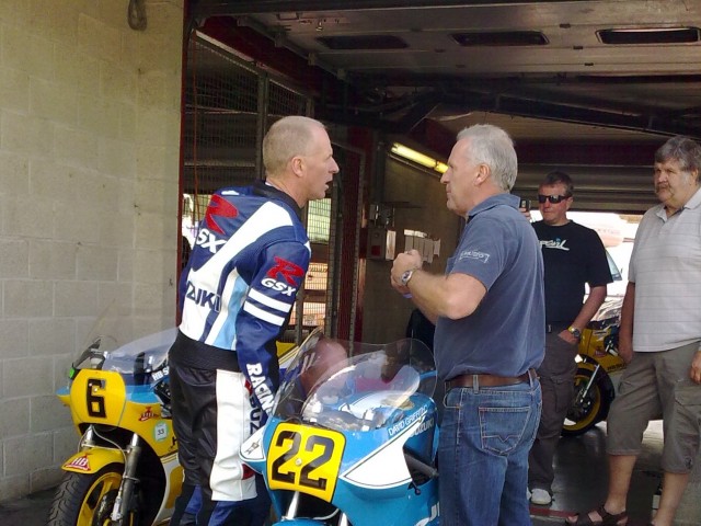 Eastern Creek Australia classic event with Classic Team Suzuki Chris Vermuland talking with Jeremy McWilliams