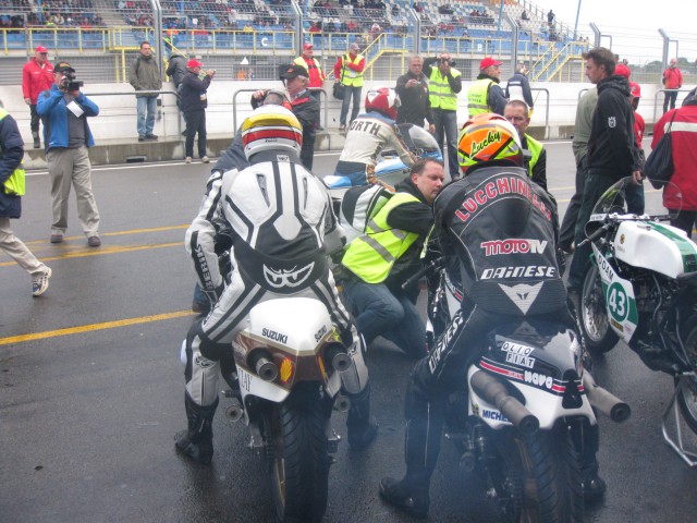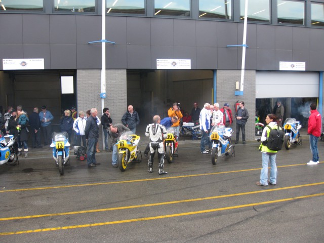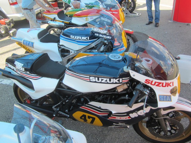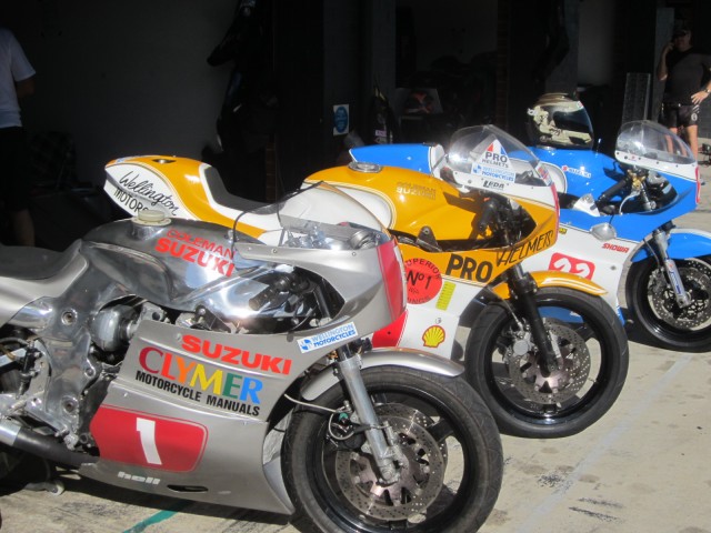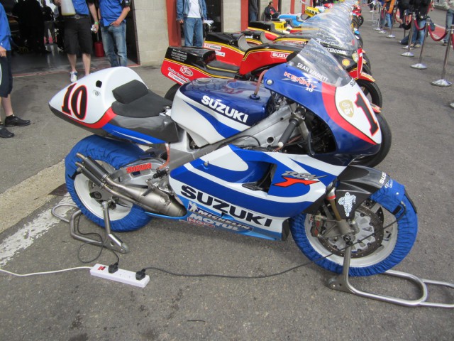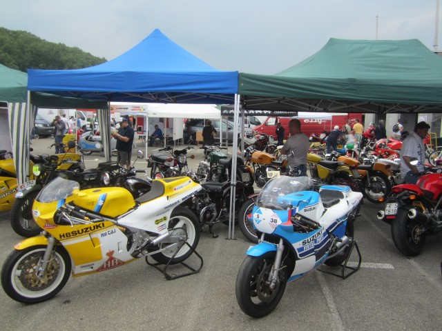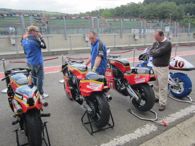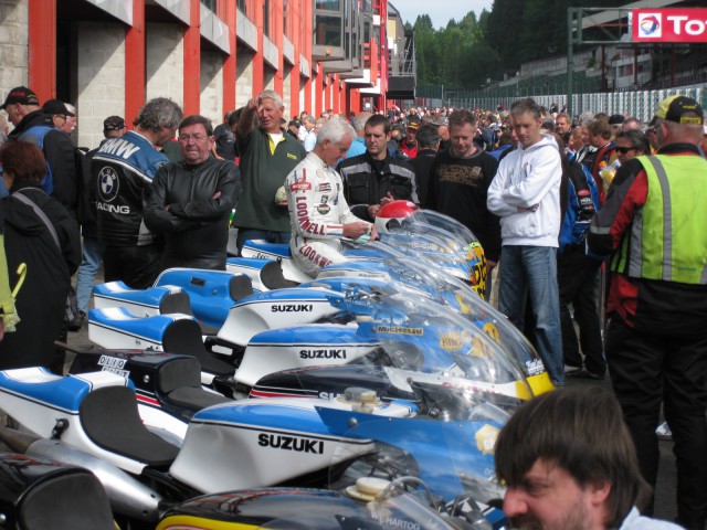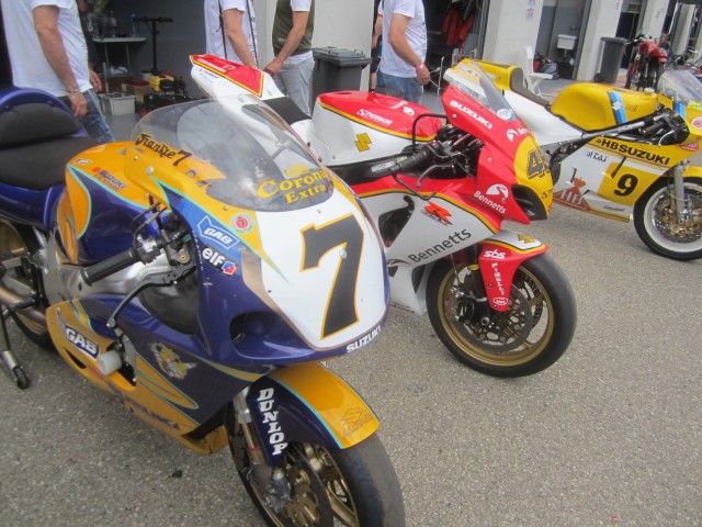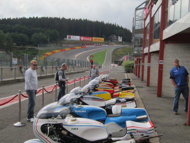 Spa franco Champs 2010 Classic team Suzuki here all the machines ready for the off, 9 Bikes, 6 riders, 2 Ex factory Mechanics and 10 team members equates to a lot of fun