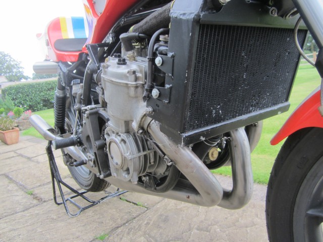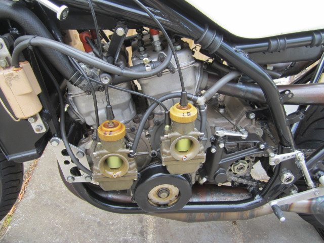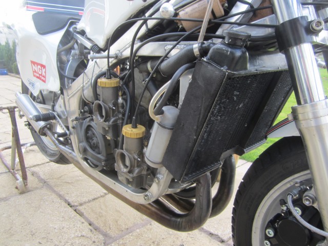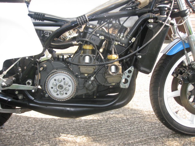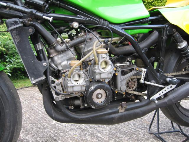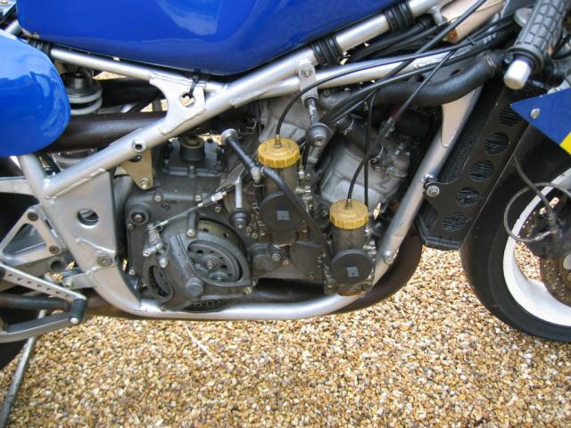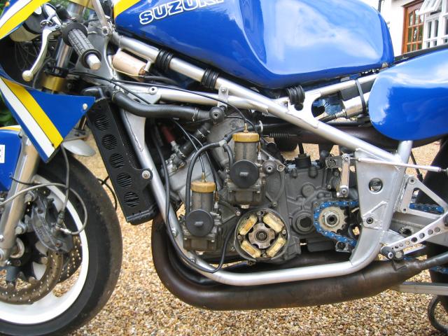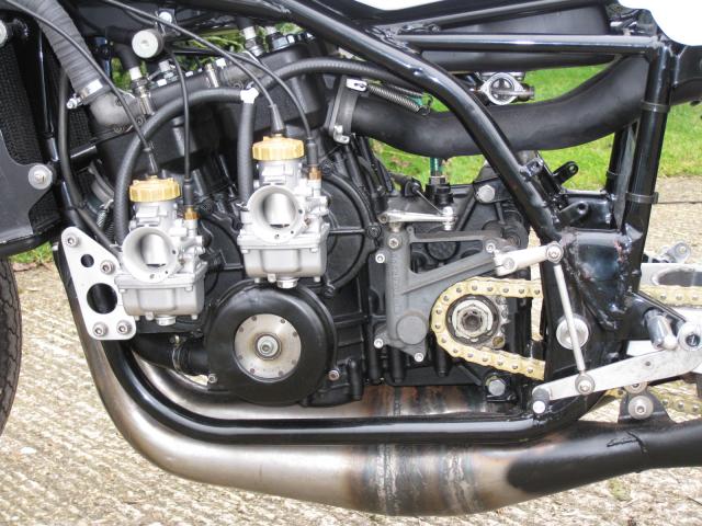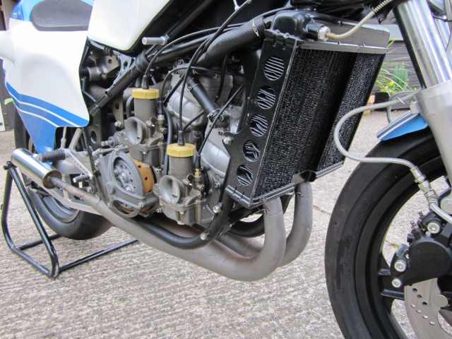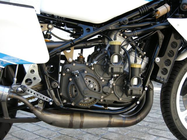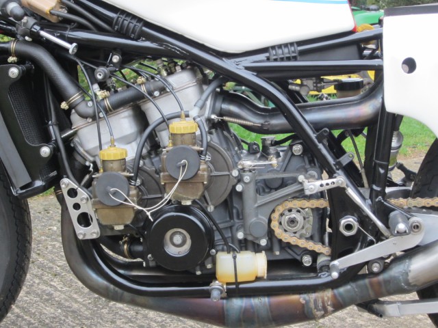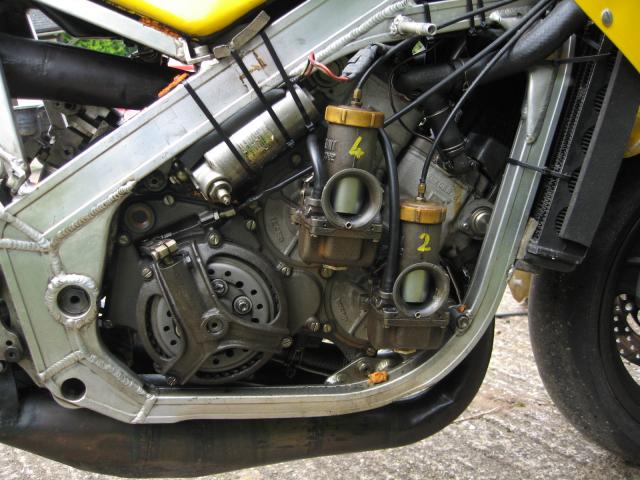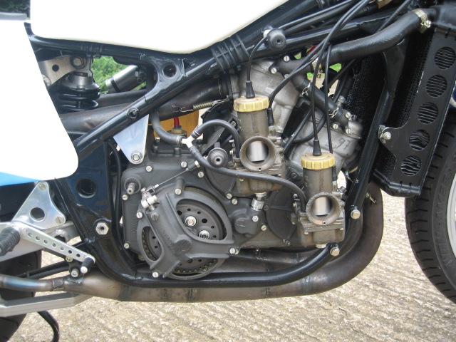 RGB500 Suzuki 1983 The left hand shot shows the Square four engine wich is a disc valve engine wearing the carbs on the left and the right hand side of the engine. The rear cylinders have the exhaust at the rear and the front cylinders with the exhausts at the front,