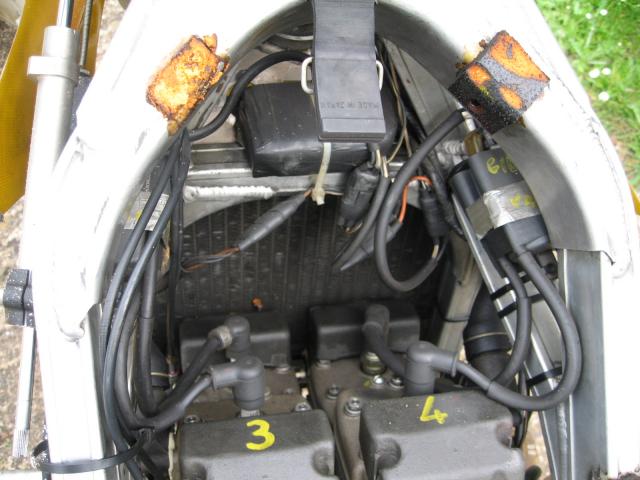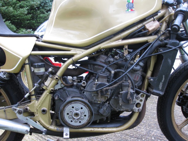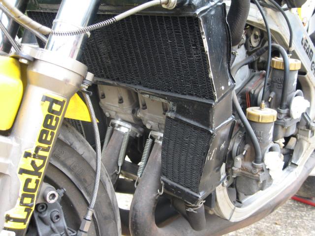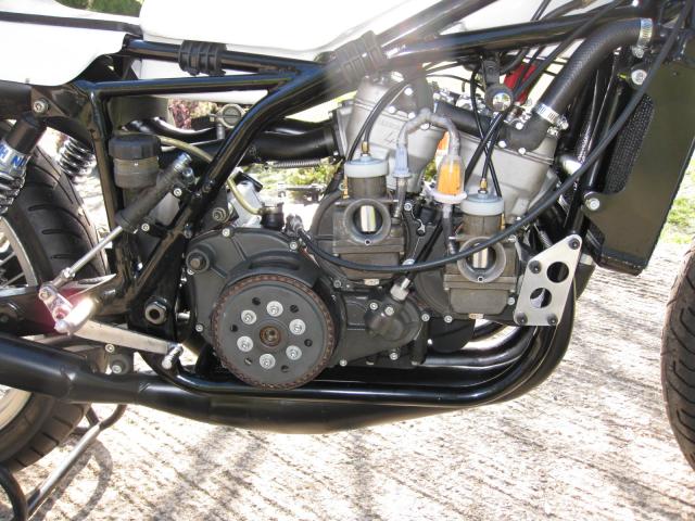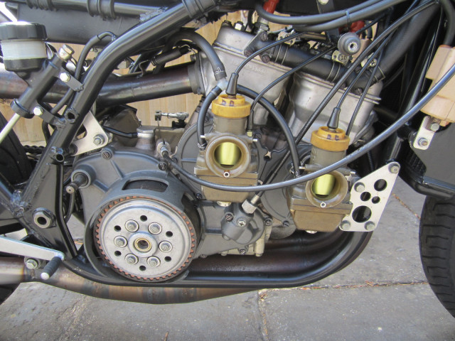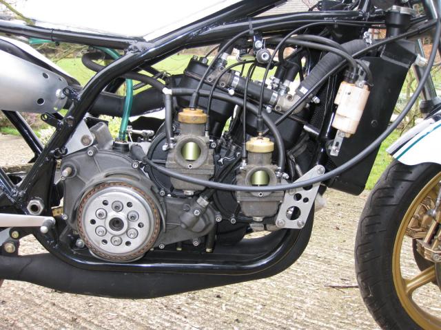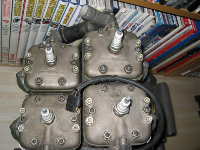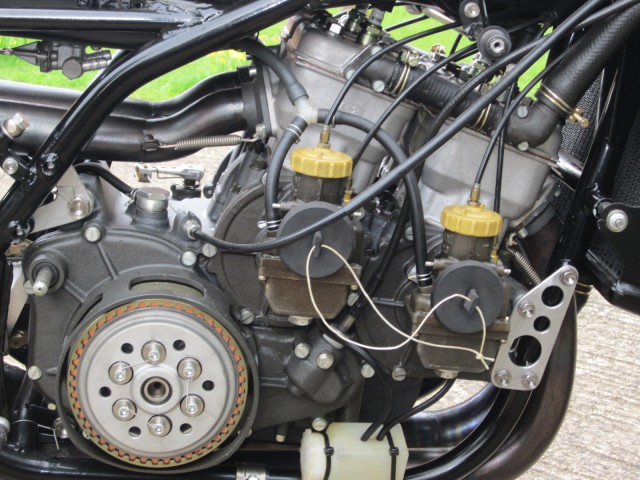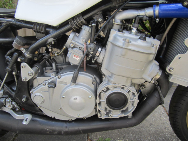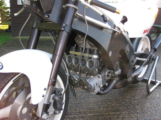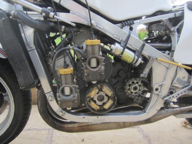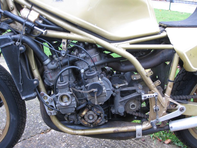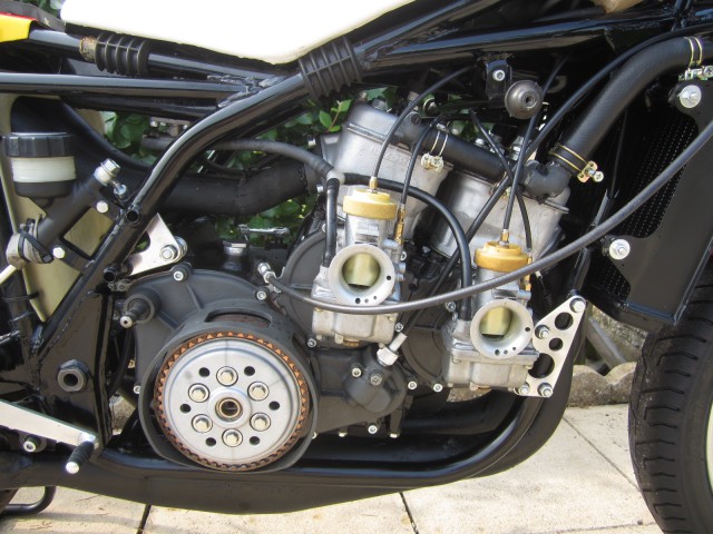 RGB500 Suzuki 1983 The left hand shot shows the Square four engine wich is a disc valve engine wearing the carbs on the left and the right hand side of the engine. The rear cylinders have the exhaust at the rear and the front cylinders with the exhausts at the front,