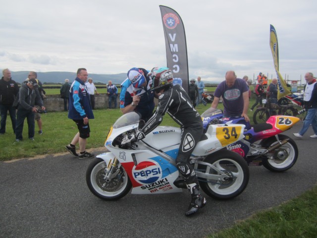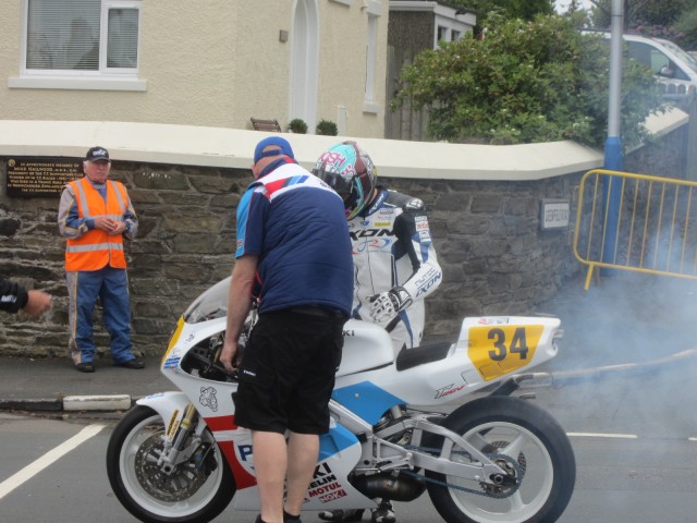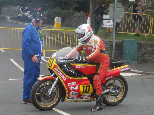 2017 Classic Manx TT with Team Classic Suzuki Suzuki RGV500 Mac and Joe with the Bike ready for Josh , he di a 119 mph ! lap on a bike he had ever ridden and the first 500 two stroke he had ridden from a standing start in a parade at the Isle of Man, just imagine what he would do in a race, it was a special moment