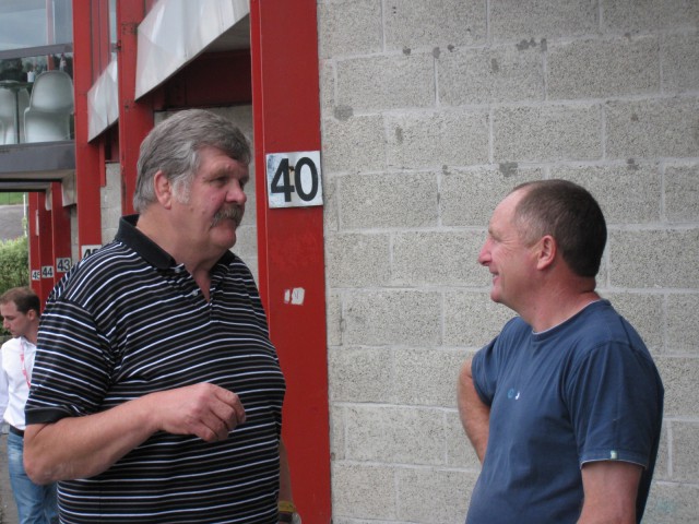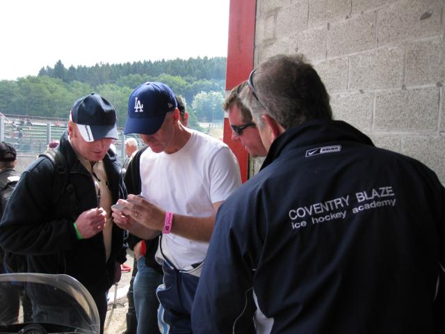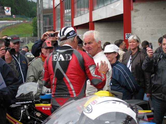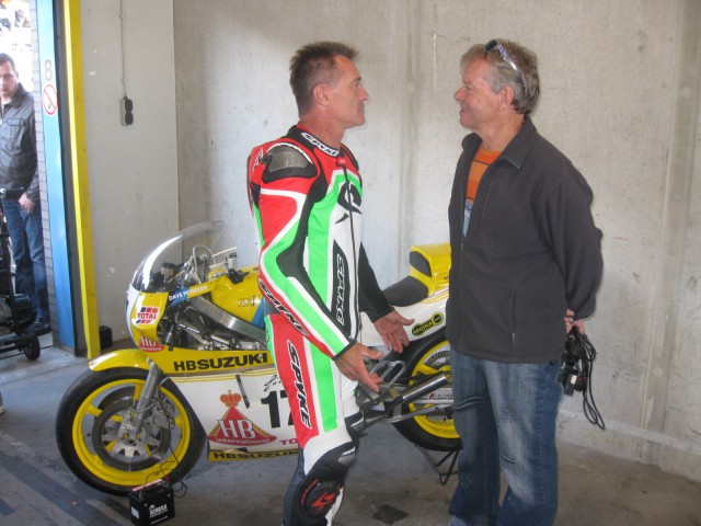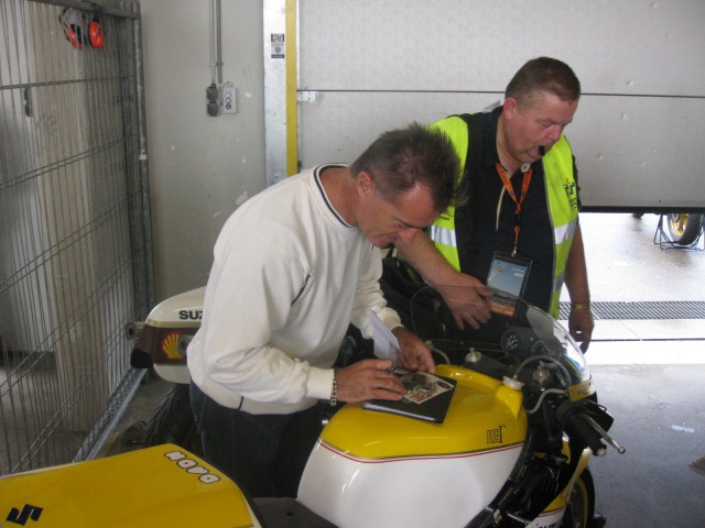 Classic Team Suzuki The great rider from Finland, a true champion of a two stroke in the 1970.s with Big Geofr Our Anchor man and ex Proffesional Rugby player from the Saints Northampton talking with Brian onother team mechanic, Also our team Photographer